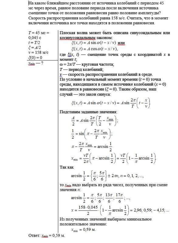 .Как это решить? 12.На каком ближайшем расстоянии от источника колебаний с периодом 1 мс через время, равное половине периода после включения источника смещение точки от положения равновесия равно половине амплитуды? Скорость распространения колебаний равна 331 м/с. Считать, что в момент включения источника все точки находятся в положении равновесия.