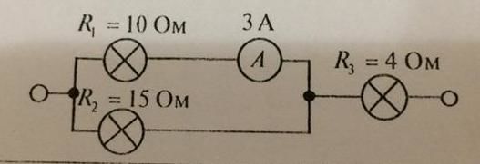 Параллельные ветки одинаковое падение напряжений значит I1*R1=I2*R2 отсюда I2=2 А., через третий резистор течёт ток I3=I1+I2=3+2=5 А, значит искомая мощность Р=(5^2)*4=100 Вт.