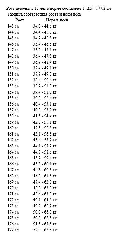 Какова норма веса девочки в 13 лет при росте 170 см?