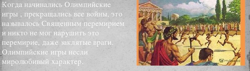 На момент проведения Олимпийских игр прекращались войны. Именно это и стало причиной того, почему эти игры называли праздниками мира.