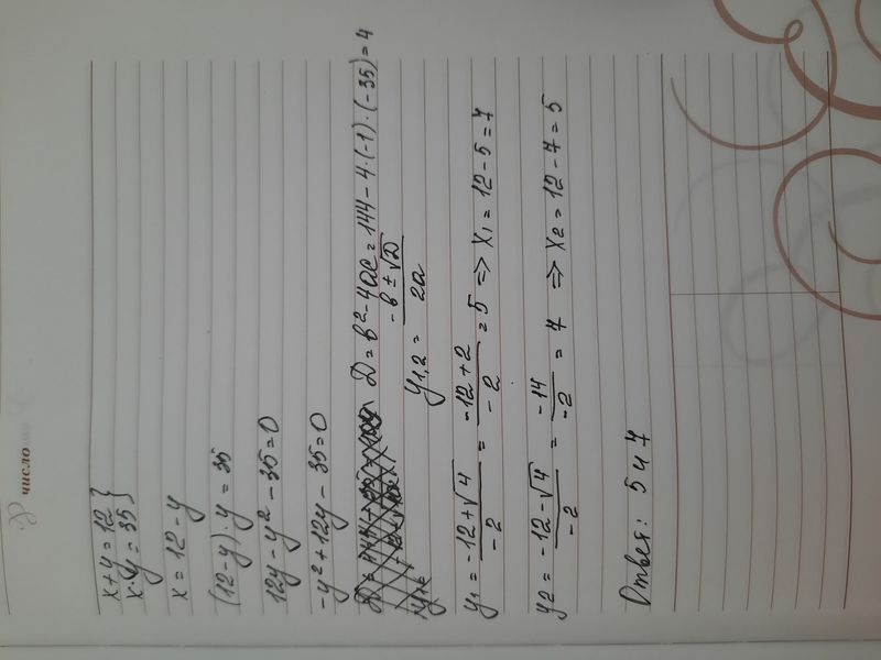 Сумма двух чисел равна 12, произведение - 35. Найдите эти числа