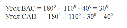 В четырехугольнике ABCD проведена диагональ AC. известно,что угол ABC=110⁰ BCA=40⁰,а противолежащие стороны BC и AD параллейны,чему равны углы CAD и BAC