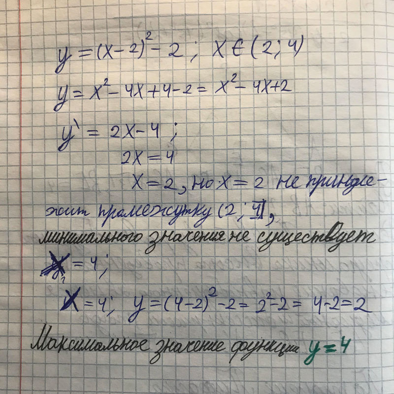 Найдите наименьшее и наибольшее значения функции y=(x-2)^-2 на полуинтервале (2; 4]