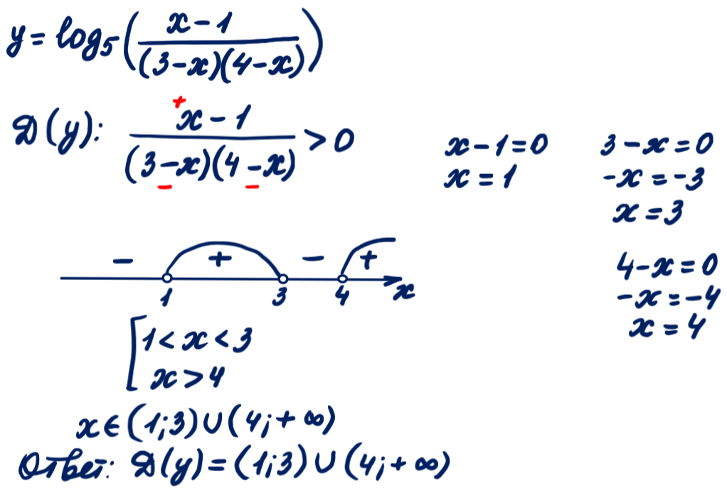 Найти область определения функции y=log_5〖(x-1)/((3-x)(4-x))〗