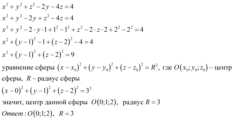 Сфера задана уравнением Х^2+У^2+Z^2-2y-4z=4 А) найти координаты центра и радиус сферы