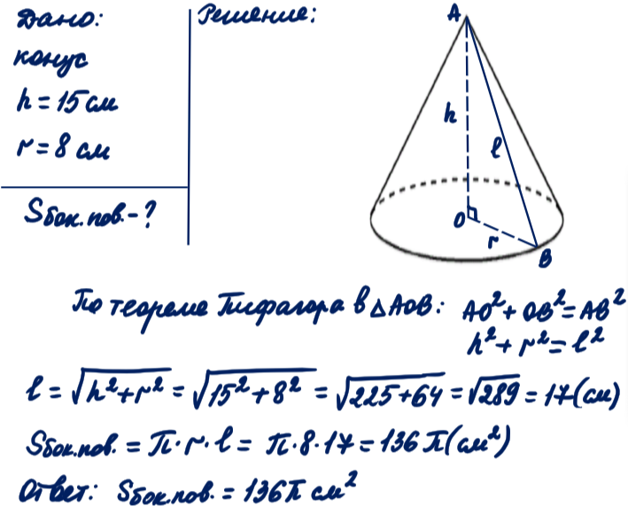 Высота конуса 15 см,а радиус основания 8 см.Найдите величину боковой поверхности.