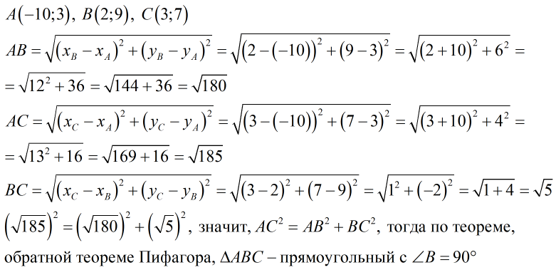 Даны точки A(-10; 3), B(2;9), C(3;7). Докажите что треугольник ABC прямоугольный