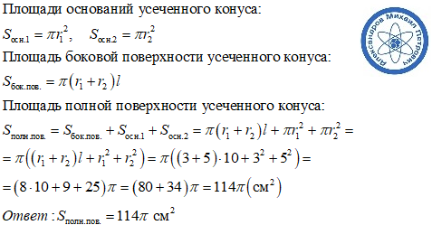 Найдите площадь полной поверхности усеченого конуса если радиусы его основания 3см и 5см а образующая равна 10см