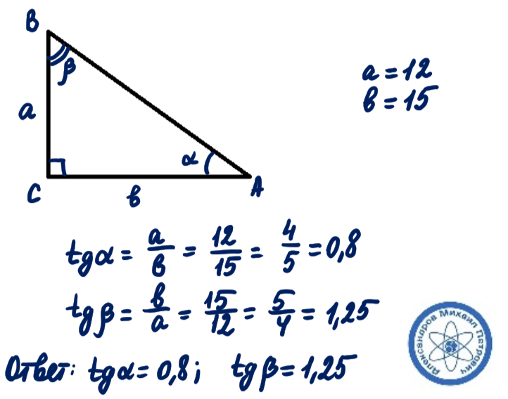 Катет a=12,b=15, найти тангенсы углов прямоугольного треугольника.