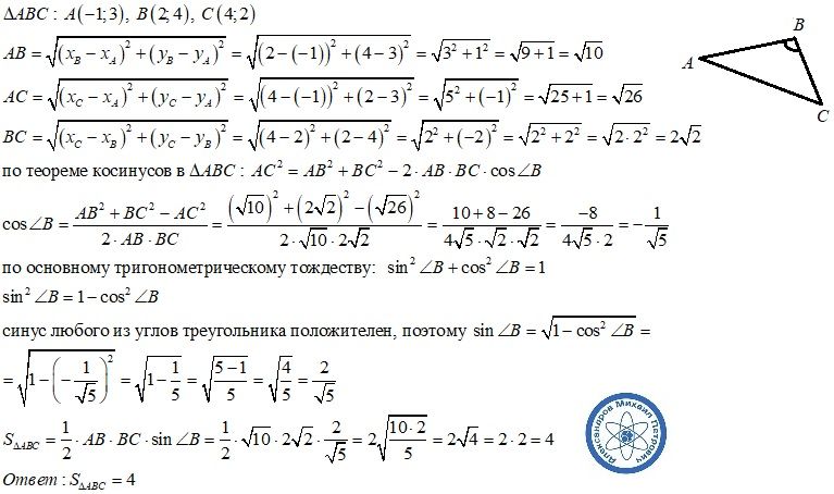 Найти площадь треугольника авс, если А(-1;3),В(2;4),С (4;2)