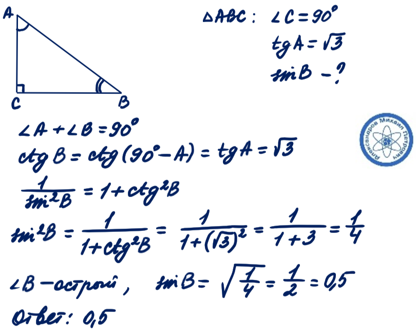 В треугольнике АВС угол С равен 90, tgА = корень из 3. найдите sinВ