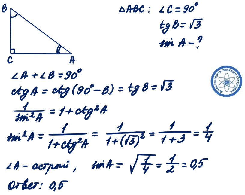 В треугольнике АВС угол с равен 90, tgB=√3 Найдите sinА