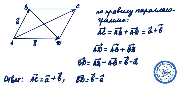 В параллелограме ABCD AB = a(вектор),AD = в(вектор). Выразите векторы AC и BD через векторы а и в