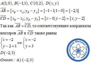 . Даны три точки: А(1;0), В(-1;1), С(0;2;). Найдите точку Д(x,y), если известно, что векторы АВ и СД равны А) (-2;3) В) (2;3) С) (-2;-3) Д) (0;-2) Е) (-3;0)