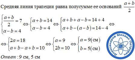 Средняя линия трапецииравна 7 см,разность оснований 4 см.найти основания