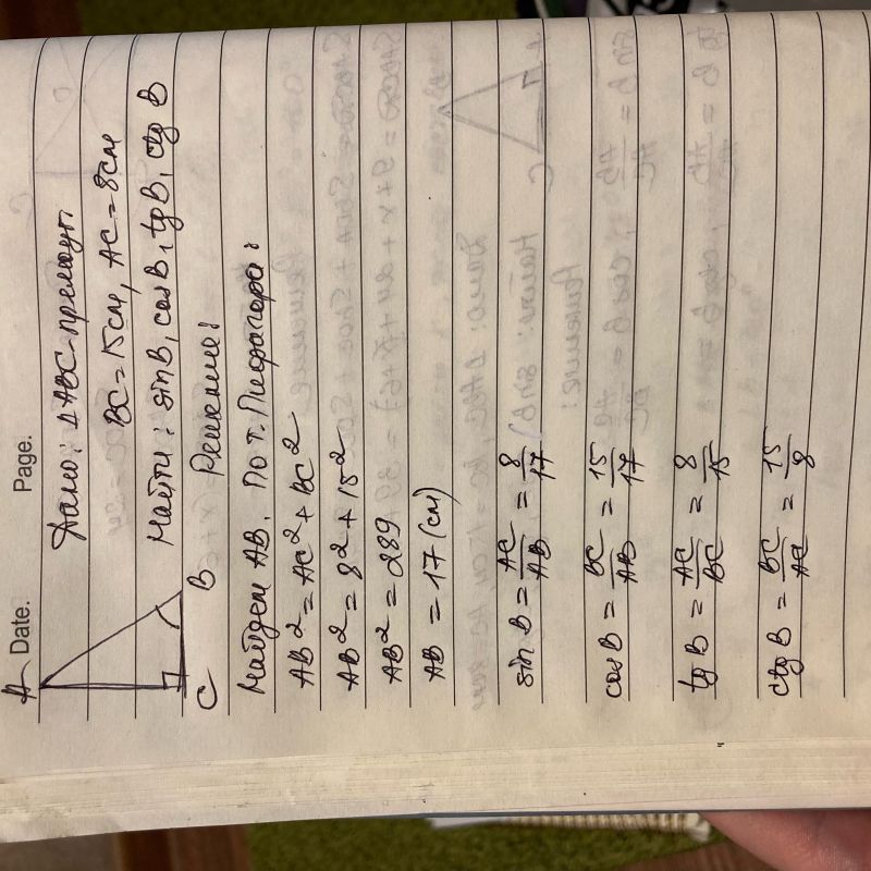 Триугольник ABC. BC= 15см, AC=8 см Найти SinB CosB tgB ctgB