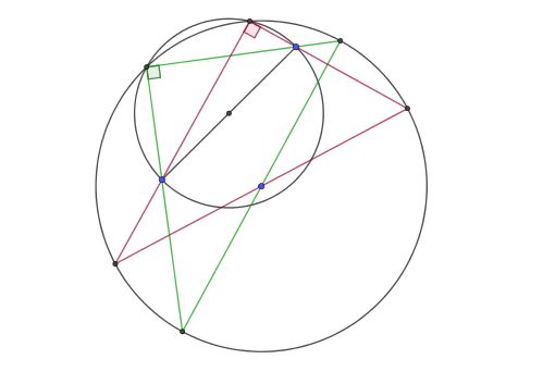Требуется построить прямоугольный треугольник, вписанный в данную окружность так, чтобы его катеты проходили через две заданные точки. Укажите одно или несколько ГМТ, которые потребуются для построения. ГМТ, находящихся на заданном расстоянии от данной точки ГМТ, находящихся на заданном расстоянии от данной прямой ГМТ, равноудаленных от двух точек ГМТ, равноудаленных от двух параллельных прямых ГМТ, равноудаленных от двух пересекающихся прямых ГМТ, из которых данный отрезок виден под прямым углом