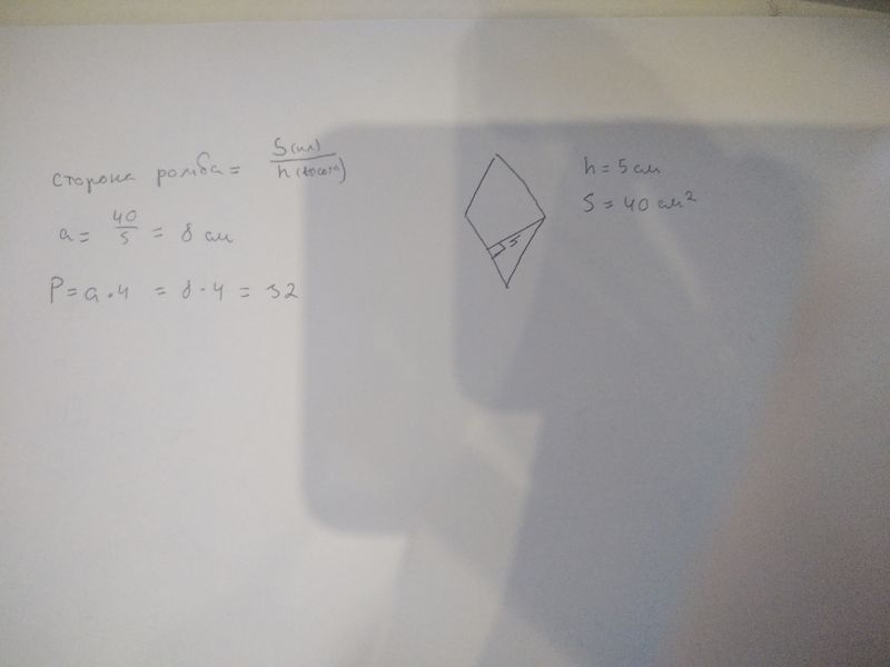Площадь ромба равна 40 см², а высота равна 5см. Найдите периметр этого ромба.