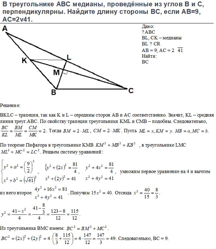 Если BC^2 = 49, то ВС = √49 = 7. Откуда у Вас BC = 9? Непонятно.