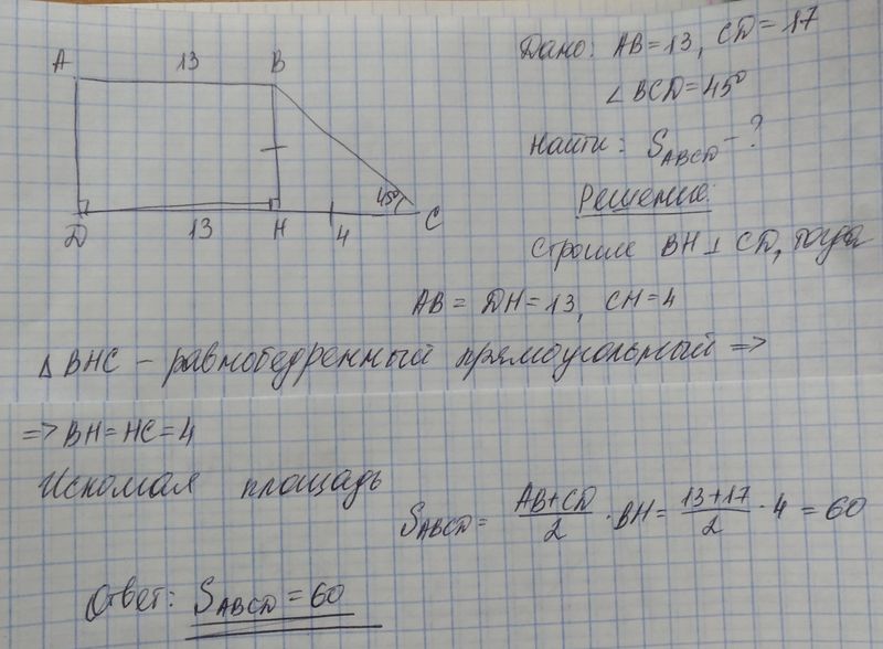 Найдите площадь прямоуг.трапеции, основания которой равны 13 и 17, большая боковая сторона составляет с основанием угол 45°