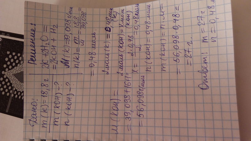Определите массу и количество веществ гидроксида калия который образуется при взаимодействии 18.8 грамм калия с водой