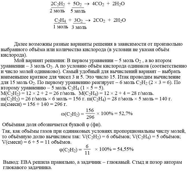 Разобраться в задаче по химии. Нужен ход решения. Определите объёмную и массовую долю ацетилена в его смеси с этиленом, если на сгорание ацетилена из этой смеси был израсходован такой же объем кислорода, что на сгорание этилена из этой смеси. Задачу решила, но с ответом не сходится. Мой ответ: объемная доля ацетилена 54,55 %. Ответ в задачнике: объемная доля 44, 4%.