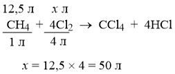 Вычислите объем хлора, который потребуется для превращения 12,5 л метана с тетрахлорметан. Выход реакции примите равным 100%. Объемы газов измерены при одинаковых условиях. Ответ запишите в литрах с точностью до целых