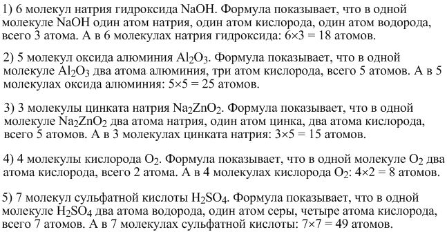 Снова химия ... Нужно посчитать количество атомов химических элементов. 1) 6 молекул натрия гидроксида 2) 5 молекул оксида алюминия 3) 3 молекулы цинка натрия 4) 4 молекулы кисню 5) 7 молекул сульфатной кислоты . Спасибо огромное за помощь, если кто-то поможет с этим .