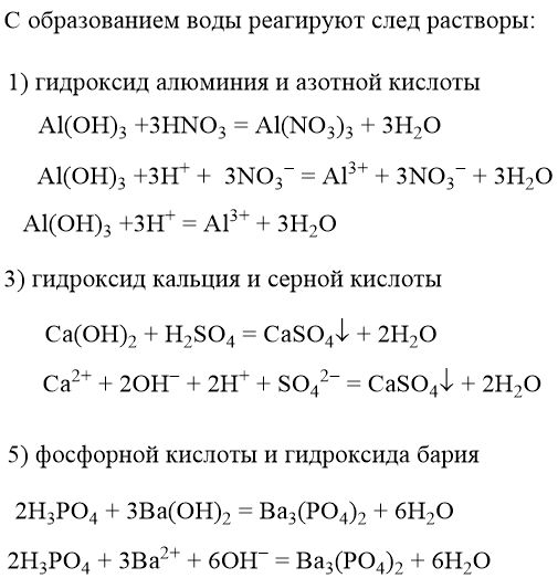 Кто разбирается в химии?! Нужно сделать такое задание: С образованием воды реагируют след растворы: 1) гидроксид алюминия и азотной кислоты 2) хлорида бария и сульфата меди (II) 3) гидроксид кальция и серной кислоты 4) нитрата серебра и хлорида аммония 5) фосфорной кислоты и гидроксида бария Записать молекулярные и ионные уравнения для всех необратимых реакций.