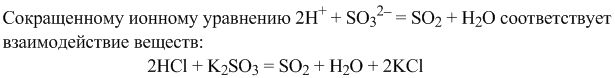 Сокращенному ионному уравнению 2H + + SO3- = SO2 + H2O соответствует взаимодействие веществ .... H₂SO₃ и Na₂SO₄ HNO₃ и BaSO₃ HCl и K₂SO₃ H₂SO₄ и K₂S HCl и Na₂SO₄ HNO₃ и Na₂SO₃