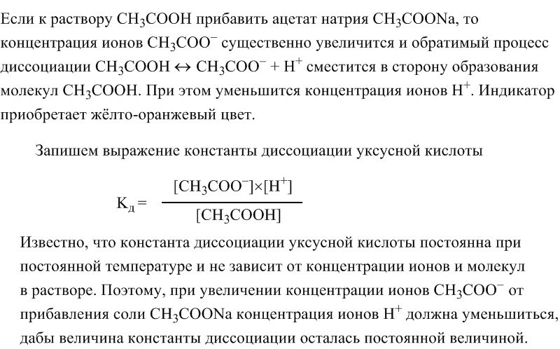 Вопрос по ХИМИИ... Очень нужно ((( В две конические пробирки поместить по 2-3 капли разбавленной уксусной кислоты и добавить по одной капле индикатора раствора метилового оранжевого. Одну пробирку оставить для сравнения, а в другую внести микрошпателем несколько кристаллов ацетата натрия и хорошо перемешать. Сравнить окраску растворов в обеих пробирках и объяснить ее изменение, пользуясь выражением константы диссоциации уксусной кислоты . Что надо добавить к раствору слабой кислоты, чтобы сместить равновесие в сторону образования малодиссоциированных молекул? Записать и объяснить наблюдаемые явления. Написать молекулярные и ионные уравнения реакций.