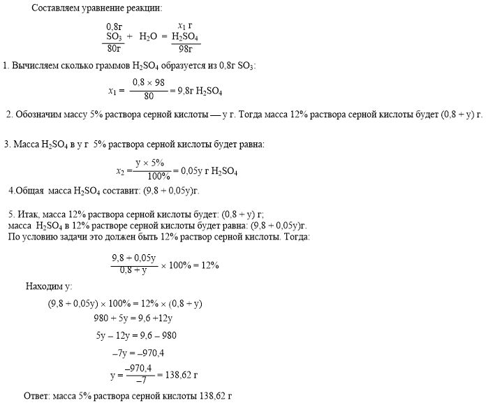 Очень прошу, очень помочь Порцию серного ангидрида массой 0,8 г добавили к 5% раствору серной кислоты. В результате образовался 12% раствор серной кислоты. Вычислите массу 5% раствора серной кислоты.