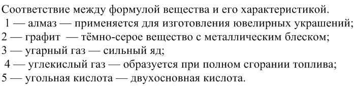 Установи соответствие между формулой вещества и его характеристикой. 1 — алмаз; 2 — графит; 3 — угарный газ; 4 — углекислый газ; 5 — угольная кислота. а — сильный яд;. б — образуется при полном сгорании топлива; в — применяется для изготовления ювелирных украшений; г — тёмно-серое вещество с металлическим блеском; д — двухосновная кислота.