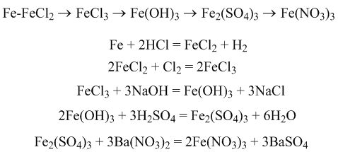 Запишите уравнения реакции,с помощью которых можно осуществить следующие превращения:Fe-FeCl2-FeCl3-Fe(OH)3-Fe2(SO4)3-Fe(NO3)3СРОЧНО!