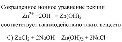 Сокращенное ионное уравнение рекции Zn^2+ +2OH^- =Zn(OH)2 соответствует взаимодействию каких веществ :A)ZnSO4+Fe(OH)3B) ZnSO4+BaCl2C)ZnCl2+NaOHD)ZnCl2+H2OE)ZnO+H2O