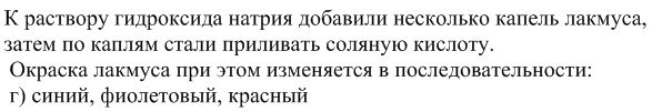 К раствору гидроксида натрия добавили несколько капель лакмуса,затем по каплям стали приливать соляную кислоту. Окраска лакмуса при этом изменяется в последовательности: а) синий, красный, фиолетовый б) фиолетовый,синий, красный в) красный, синий, фиолетовый г) синий, фиолетовый, красный