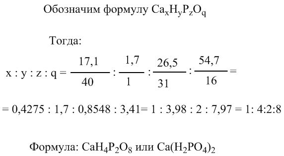 Составить молекулярную формулу вещества, если в его состав входят следующие элементы:W(Ca)=17,1%, W(H)=1,7%, W(P)=26,5%, W(O)=54,7%. Назвать вещество.