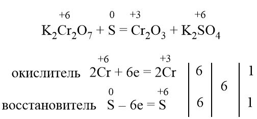 Составьте окислительно-восстановительные реакции, электронный баланс; укажите окислитель и восстановитель. K2Cr2O7 + S=Cr2O3+K2SO4