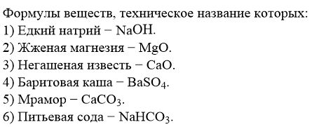Составить формулы веществ, техническое название которых: 1)Едкий натрий 2)Жженая магнезия 3)Негашеная известь 4)Варитовая каша 5)Мрамор 6)Питьевая сода