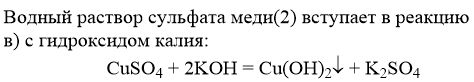 Водный раствор сульфата меди(2) вступает в реакциюА С гидроксидом железа (3)Б С водой В С гидроксидом калияГ с серебром