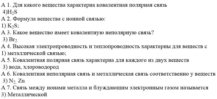 A1. Для какого вещества характерна ковалентная полярная связь 1) O2 2) Cu 3) BaO 4)H2S A2. Формула вещества с ионной связью: 1) K2S; 2) NH3 3) Fe 4) H2 A 3. Какое вещество имеет ковалентную неполярную связь? 1) NO2 2) NaCl 3) Br2 4) CO A4. Высокая электропроводность и теплопроводность характерны для веществ с 1) металлической связью; 2)ковалентной неполярной 3) ионной связью; 4) ковалентной полярной связью А5. Ковалентная полярная связь характерна для каждого из двух веществ 1) хлорид бария, алмаз 2) кислород, аммиак 3) вода, хлороводород 4) медь, метан А6. Ковалентная неполярная связь и металлическая связь соответственно у веществ 1) O2, KF 2) NH3, Cu 3) N2, Zn 4) H2O, C А6. Связь между ионами металла и блуждающим электронным газом называется 1) Ионной 2) Ковалентной неполярной 3) Металлической 4) Ковалентной полярной