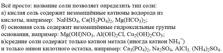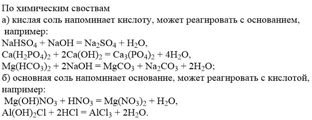Хим. свойства солей Листаю химические свойства различных солей (средних кислых основных), и не могу понять есть ли разница между ними. То есть если к примеру у основных оксидов и кислотных оксидов есть разница, то у солей я ее найти не могу. Есть ли разница вообще (именно в хим свойствах)?