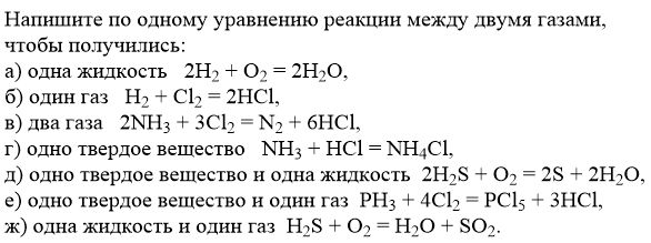 Напишите по одному уравнению реакции между жвумя газами, что бы получились: а) одна жидкость б) один газ в) два газа г) одно твердое вещество д) одно твердое вещество и одна жидкость е) одно твердое вещество и один газ ж) одна жидкость и один газ