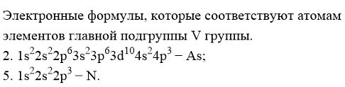 Из приведенных электронных формул выберите те, которые соответствуют атомам элементов главной подгруппы V группы. 1. ...4s24p64d35s2; 2. 1s22s22p63s23p63d104s24p3; 3. ...4s24p6; 4. 1s22s22p63s23p64s23d3; 5. ...2s22p3