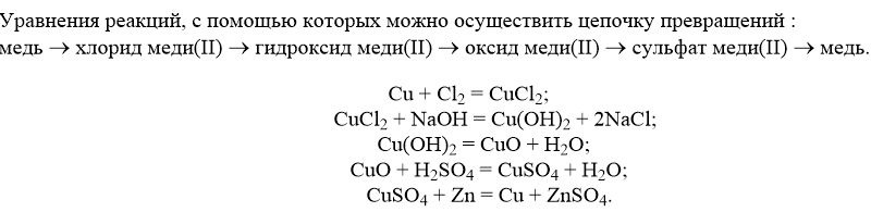 Напишите уравнение реакций, с помощью которых можно осуществить цепочку превращений веществ: Медь-Хлорид меди(II)-гидроаксид меди(II)-оксид меди(II)-суьфат меди-медь.