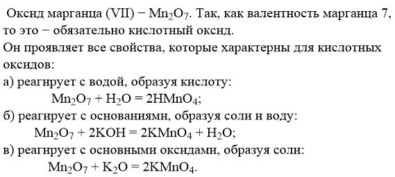 Составьте формулу оксида Марганец (+7). Кислотным или амфотерным он является? Напишите уравнение реакций, подтверждающий характер этого оксида.