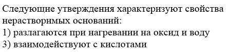 Какие утверждения характеризуют свойства нерастворимых оснований?1) разлагаются при нагревании на оксид и воду2) взаимодействуют с щелочами 3) взаимодействуют с кислотами4) взаимодействуют с солями5) взаимодействуют с основными оксидами