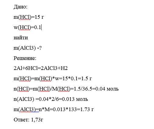 Определить массу соли, которая образуется при взаимодействии 15г 10% раствора соляной кислоты с алюминием