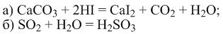 Допишите уравнения реакций: а) CaCO3+HI-> . . . б) SO2+H2O-> . . .