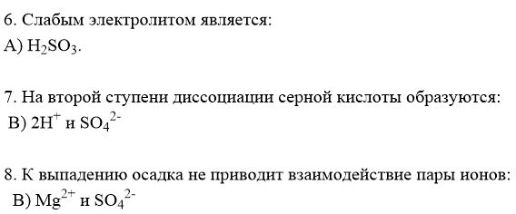 6. Слабым электролитом является: А) H2SO3 Б) H2SO4 В) Na2CO3 Г) Al2(SO4)3 7. На второй ступени диссоциации серной кислоты образуются: А) H+ и HSO4 - Б) 2H+ и HSO4 2- В) 2H+ и SO4 2- Г) H+ и SO4 2- 8. К выпадению осадка не приводит взаимодействие пары ионов: А) Вa2+ и SО42- Б) Al3+ и ОН- В) Mg2+ и SО32- Г) Cr3+ и F-
